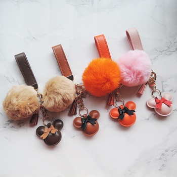 Wowei Design Personalizado Multi-Color Couro De Luxo Minnie Car Keychain Corda Combinando Natural Angorá Pele De Coelho Bola Mão